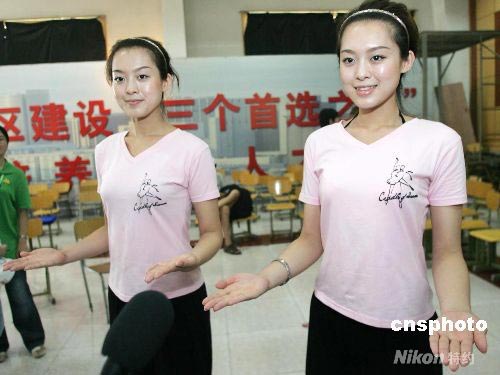 7月24日,中外記者前往北京昌平職業(yè)學校探營,19歲雙胞胎姐妹花李子曄、李曉曄,在眾多頒獎禮儀志愿者中分外搶眼。自2008年7月12日,337名身材修長、面容嬌美的頒獎儀式專業(yè)志愿者開始北京奧運會頒獎禮儀工作的沖刺培訓(xùn)。較之以往,此次培訓(xùn)除了頒獎禮儀動作、形體訓(xùn)練,特別增加了奧運安保、拓展運動和藝術(shù)觀摩等課程。本月26日,這批志愿者將到各個場館進入賽前實地訓(xùn)練。 中新社發(fā) 杜燕 攝
