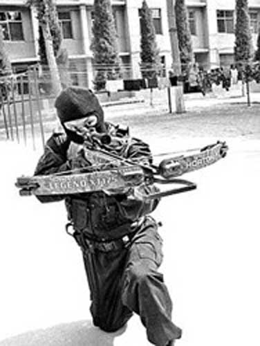 自述:我的外形很傳統(tǒng),乍一看,有些古代暗器的感覺(jué)。但我的威力卻不是其他普通弓箭所能比擬的。有了高科技的幫助,我的射程大大提高!鞍俨酱睢笔枪糯呤值慕^技。但如今,有了紅外線(xiàn)瞄準(zhǔn)器的幫助,任何反恐突擊隊(duì)員在使用我時(shí),都可以百發(fā)百中。而強(qiáng)力弩弓的穿透力甚至能將15厘米厚的樹(shù)木一擊即穿。