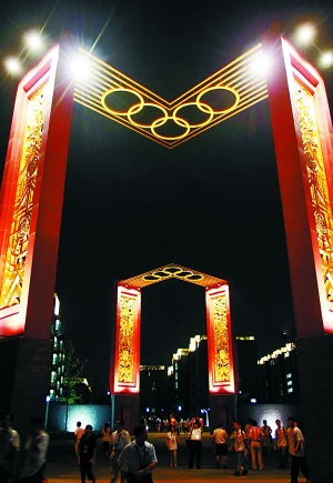 走出宿舍,透透氣,我發(fā)現(xiàn)這里還有12個居民服務(wù)中心,里面吃喝玩樂都有。當(dāng)夜幕降臨,我看到那個奧運(yùn)村生活區(qū)朱紅大門上燈火輝煌,五環(huán)標(biāo)志十分醒目。的確,我們是為了奧林匹克精神來到這里。