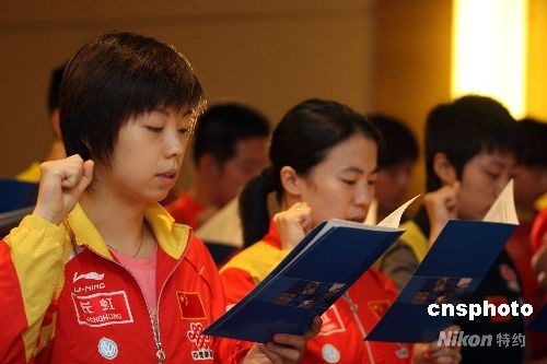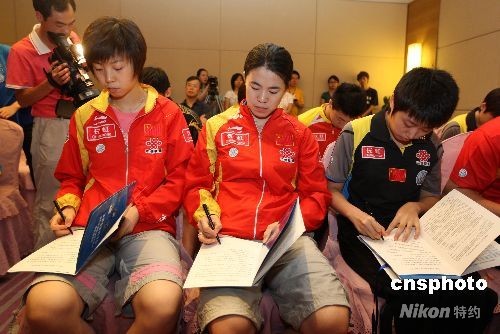 7月27日晚,即將參加北京奧運(yùn)會(huì)的中國(guó)乒乓球隊(duì)的運(yùn)動(dòng)員、教練員和其他輔助人員,在江蘇無(wú)錫簽訂中國(guó)體育代表團(tuán)反興奮劑承諾書(shū)。