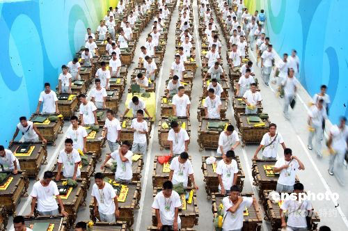 第29屆夏季奧運(yùn)會(huì)開幕式彩排在北京國家體育場“鳥巢”封閉進(jìn)行,眾多參演人員攜帶各種道具進(jìn)入體育場。 中新社發(fā) 武仲林 攝