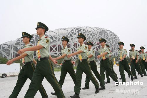 第29屆夏季奧運會開幕式彩排在北京國家體育場“鳥巢”內(nèi)封閉進行,武警、特警現(xiàn)場戒備,保安嚴(yán)密。 中新社發(fā) 武仲林 攝