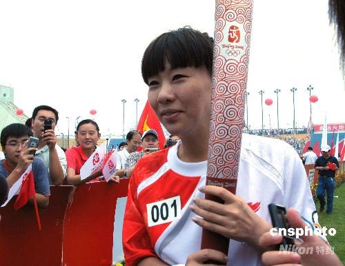 7月31日,奧運(yùn)火炬“祥云”如約與七百余萬(wàn)唐山民眾見(jiàn)面,在這座古老美麗、浴火重生的鳳凰城傳遞和平、友誼、和諧與希望。上午8時(shí),起跑儀式在唐山市體育中心舉行。圖為奧運(yùn)游泳冠軍錢紅作為首棒火炬手,開(kāi)始奧運(yùn)火炬在河北省最后一站唐山的傳遞。中新社發(fā) 牛琳 攝