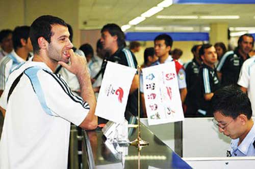 飛機比預(yù)定的時間晚到了幾分鐘,11時45分,阿根廷國奧隊的運動員走出機艙,他們談笑風(fēng)生,顯得非常輕松。通過檢測體溫區(qū)域后,馬斯切拉諾第一個站到了邊檢驗證臺前。“您好!”邊檢民警用西班牙語向這位著名球員表示問候,并很快幫他辦理了入境通關(guān)手續(xù)。