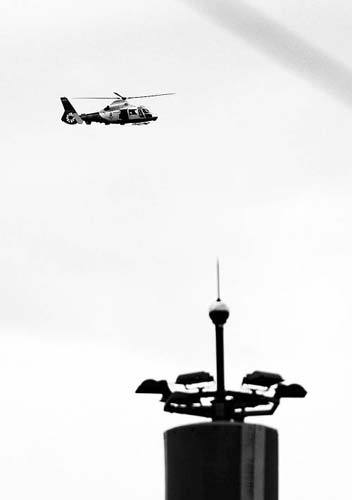 8月1日,執(zhí)行安保任務(wù)的國產(chǎn)警用直升機(jī)盤旋在北京奧運場館上空。 喻志勇攝