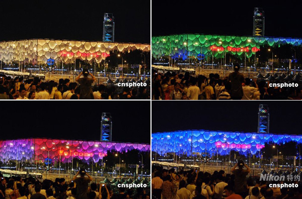 8月2日晚,國家游泳中心“水立方”亮燈,瞬間色彩變幻莫測。 中新社發(fā) 王東明 攝