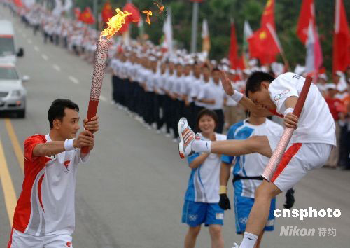 8月3日,奧運(yùn)火炬在四川廣安傳遞,火炬手周勇與畢磊交接火炬時,畢磊手持祥云火炬展示起中國功夫。 中新社發(fā) 廖攀 攝