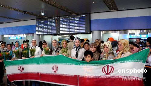 八月三日,數(shù)十位在北京工作、留學的伊朗人,攜帶鮮花、國旗和糕點在北京首都國際機場迎候本國的體育健兒。其中一支“美女歡迎團”在航站樓奧運專用出口處匯成一景。 中新社發(fā) 黃翔 攝