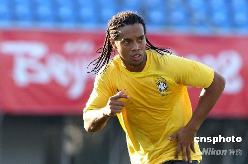 圖:羅納爾迪尼奧認真進行奧運賽前訓練