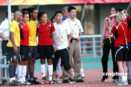8月3日下午,參加北京奧運(yùn)會(huì)足球比賽的巴西男足在沈陽首次訓(xùn)練后,與前來準(zhǔn)備訓(xùn)練的德國女足隊(duì)員巧遇并合影留念。 中新社發(fā) 張宇 攝