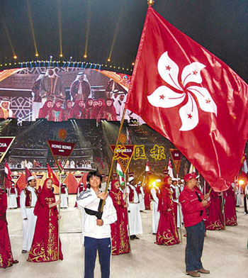 黃金寶將手持特區(qū)區(qū)旗走進北京奧運會。圖為多哈亞運會。(圖片來源:文匯報)