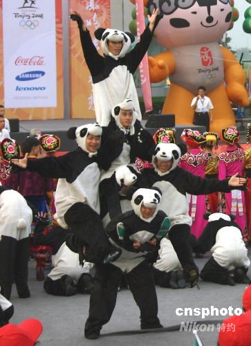 8月5日上午,奧運火炬在成都傳遞,多才多藝的成都人在火炬?zhèn)鬟f起點“成都出口加工園”舉行了精彩的文藝表演。圖為裝扮成大熊貓的雜技演員在表演。中新社發(fā) 黃永莉 攝