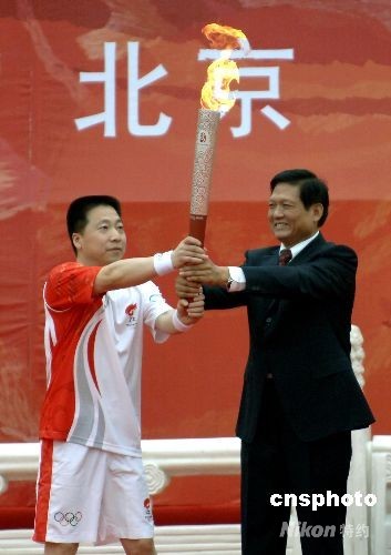 8月6日上午,北京奧運火炬?zhèn)鬟f在午門正式開始。圖為“航天英雄”楊利偉從北京市委書記劉淇手里接過首棒火炬。中新社發(fā) 王東明 攝