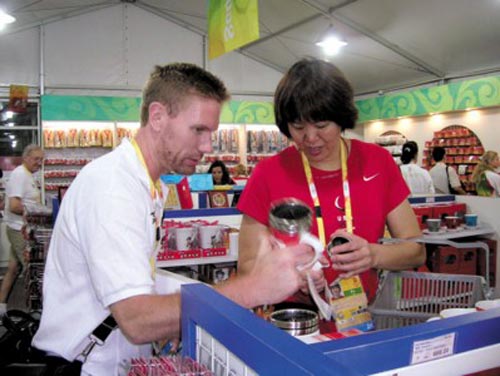 結(jié)果,廣東姑娘謝杏芳買了一大箱子的福娃茶盅,每個小小的茶盅上都有福娃頭像,一套72件。不用說,林丹提著。這下只能提前收工了,林丹迅速提了兩套福娃玩偶,還有帽子,小玩意兒,“明天再來吧!彼f。收銀臺一算:2141元。謝杏芳掏出銀行卡,不料收銀員說:“只收VISA。”喔,誰讓這里是奧運(yùn)村呢。謝杏芳掏出錢包,現(xiàn)金沒帶夠,有點(diǎn)兒尷尬。這時候老帥湯仙虎上場了,他打開錢包,爽快地替弟子付了錢。此時的林丹,倒不是“不接翎子”,是真給人拖住簽名去了。