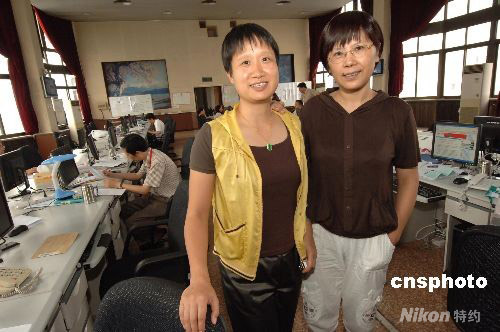 8月6日,在1988年(第24屆)漢城奧運會上,為中國奪得該屆第一枚金牌的女子跳水運動員許艷梅(左),做客中國新聞社,與體育部參加北京奧運會采訪的知名記者王祖敏(右)在奧運報道大廳合影留念。 中新社發(fā) 鄒憲 攝
