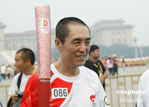 8月6日上午,北京奧運(yùn)會圣火在北京市傳遞。著名電影導(dǎo)演、奧運(yùn)開幕式總導(dǎo)演張藝謀擔(dān)任火炬手傳遞奧運(yùn)火炬,在結(jié)束火炬?zhèn)鬟f后張藝謀感慨萬分,激動不已。 中新社發(fā) 馬毅行 攝