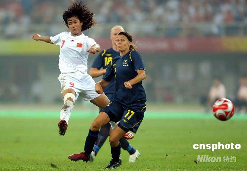 8月6日,北京奧運(yùn)會女足小組賽首輪比賽全面打響,中國女足在天津奧林匹克球場迎戰(zhàn)瑞典隊(duì)。下半場第73分鐘,中國女足9號韓端大力施射破門,打入致勝一球。 中新社發(fā) 陳文 攝