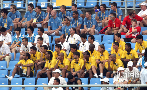 8月6日,北京奧運會沈陽足球分賽場女足預賽,巴西對德國0:0戰(zhàn)平。圖為巴西男足隊員觀看比賽。 中新社記者 張宇 攝