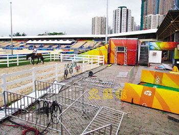 8號(hào)風(fēng)球發(fā)出了12個(gè)小時(shí),香港奧運(yùn)馬術(shù)賽場(chǎng)地受到考驗(yàn),一些裝飾、9支旗桿被勁風(fēng)吹倒,主要比賽設(shè)備和其它訓(xùn)練場(chǎng)地未受到影響,室內(nèi)盛裝舞步場(chǎng)供馬匹如常訓(xùn)練。