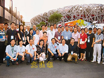 以香港文匯報社長張國良為團(tuán)長的香港新聞界訪京團(tuán)抵京率先察看奧運之旅。圖為訪京團(tuán)成員在鳥巢前合照。(圖片來源:文匯報)