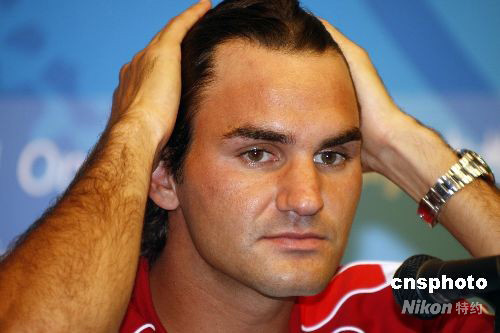 8月7日,瑞士網(wǎng)球天王羅杰·費德勒在北京奧運新聞中心召開發(fā)布會。費德勒將在8月8日開幕式當天度過自己27歲生日。 中新社發(fā) 杜洋 攝