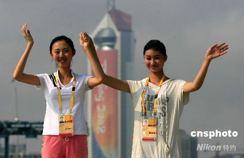 8月7日,青島迎來入夏以來最酷熱的天氣,奧帆賽頒獎(jiǎng)禮儀小姐們?cè)隍滉柶貢裣逻M(jìn)行排練,模擬奧帆賽頒發(fā)獎(jiǎng)牌的所有過程。按照要求,在長(zhǎng)達(dá)幾十分鐘的排練時(shí)間里,她們一直面帶微笑,舉止大方彬彬有禮。一遍遍苦苦排練熱得女孩們滿臉汗珠,但沒人叫苦,展示青島女孩最美的一面。 中新社發(fā) 周青先 攝