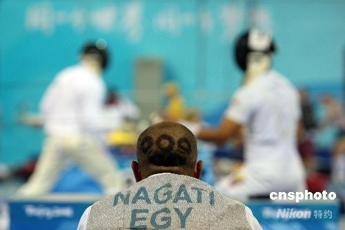 8月7日,北京國家會議中心擊劍館,一名“頭頂五環(huán)”的埃及運動員正在觀看其他運動員訓練。 中新社發(fā) 盛佳鵬 攝