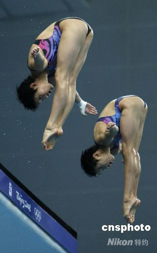 圖為女子雙人10米跳臺跳水組合陳若琳、王鑫“水立方”試水。 中新社發(fā) 杜洋 攝