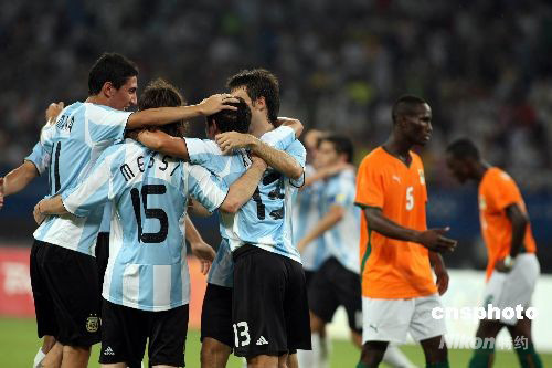 8月7日,北京奧運(yùn)會(huì)上海足球分賽場(chǎng)男足預(yù)賽,在衛(wèi)冕冠軍阿根廷隊(duì)對(duì)陣科特迪瓦的比賽中, 阿根廷以2:1戰(zhàn)勝對(duì)手迎來(lái)開門紅。 中新社發(fā) 湯彥俊 攝