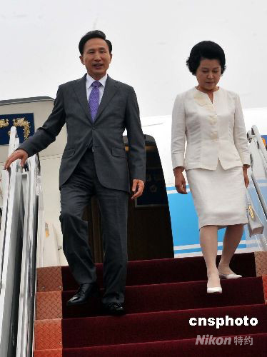 韓國總統(tǒng)李明博8月8日上午9 時許抵達(dá)北京,將出席北京奧運會開幕式及相關(guān)活動。 中新社發(fā) 宋吉河 攝