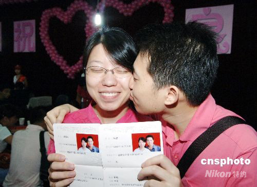 8月8日,北京奧運(yùn)會(huì)開幕日,來自中國民政部的消息顯示,中國各地將有數(shù)十萬對(duì)新人喜結(jié)良緣,創(chuàng)下新中國成立以來日登記量最大的婚姻登記高峰。圖為8月8日早晨8點(diǎn)8分,福州一對(duì)新人領(lǐng)到結(jié)婚證書后深情相吻。中新社發(fā) 劉可耕 攝