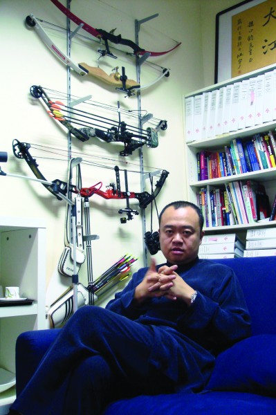 走進趙小鈞在上海的辦公室,初看之下,陳設有些雜亂。電腦桌上方隨意粘貼的,有他不同時期的照片和肖像漫畫;墻壁上也是滿滿當當,西洋畫挨著中國書法,弓箭望著書櫥,琳瑯滿目。