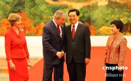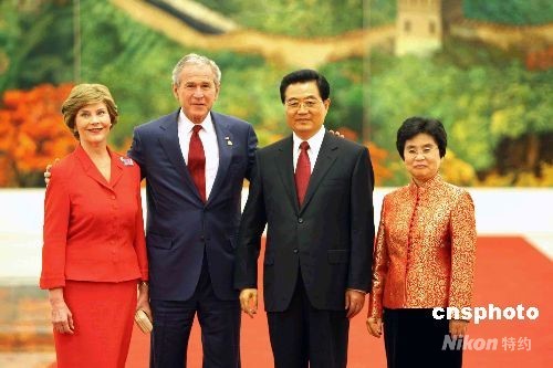 8月8日中午,中國國家主席胡錦濤和夫人劉永清在北京人民大會(huì)堂為出席北京奧運(yùn)會(huì)的貴賓舉行歡迎宴會(huì)。圖為胡錦濤夫婦歡迎美國總統(tǒng)布什夫婦。中新社發(fā) 任海霞 攝