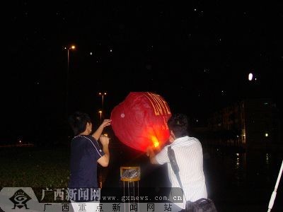 7日晚,南寧部分中學(xué)的一些學(xué)生在南寧市民生廣場(chǎng)舉行七夕放飛孔明燈活動(dòng),活動(dòng)以“為災(zāi)區(qū)祈福、為奧運(yùn)加油”為主題。筆者在民生廣場(chǎng)上看到,由同學(xué)們自己出資購(gòu)買的150盞孔明燈被先后點(diǎn)燃,緩緩地飄向無(wú)邊無(wú)際的夜空,不少同學(xué)將自己的祝福與心愿寫在燈上。