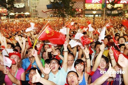 8月8日晚,北京奧運(yùn)會(huì)盛大開幕。中外游客自發(fā)聚集在北京王府井大街觀看大屏幕電視直播的奧運(yùn)會(huì)開幕式盛況,舞動(dòng)手中的五星紅旗、北京奧運(yùn)會(huì)會(huì)旗為中國(guó)加油喝彩、為奧運(yùn)狂歡。中新社發(fā) 鄭雄增 攝