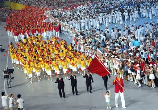 8月8日第29屆奧運(yùn)會(huì)開(kāi)幕,中國(guó)代表團(tuán)入場(chǎng),旗手為姚明,和姚明一同牽手進(jìn)入會(huì)場(chǎng)的是獲得英雄少年的光榮稱(chēng)號(hào)的四川省阿壩州少年。