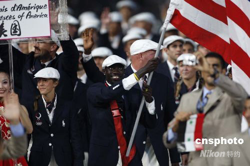 圖為美國(guó)旗手洛佩茲·拉蒙和美國(guó)奧運(yùn)代表團(tuán)入場(chǎng)。 中新社發(fā) 杜洋 攝