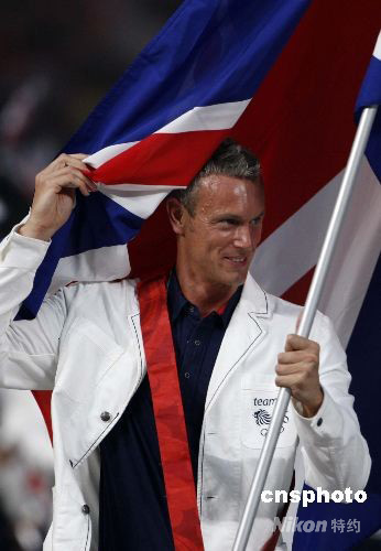 英國游泳運動員馬克·福斯特為英國代表團高舉大旗。中新社發(fā) 杜洋 攝