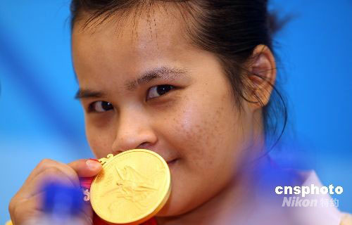 8月9日上午,中國(guó)舉重選手陳?ài)葡荚诒本⿰W運(yùn)會(huì)女子舉重48公斤級(jí)決賽中氣勢(shì)如虹,以總成績(jī)212公斤打破奧運(yùn)會(huì)記錄,力壓各路群芳獲得冠軍,為中國(guó)軍團(tuán)斬獲本屆奧運(yùn)會(huì)的第一枚金牌。中新社發(fā) 任晨鳴 攝