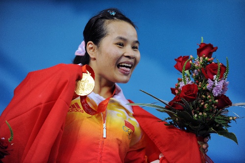8月9日,中國選手陳燮霞在頒獎儀式上向觀眾致意。當日,中國選手陳燮霞在北京奧運會女子48公斤級舉重比賽中以212公斤的總成績獲得冠軍,為中國代表團捧得首金。 新華社記者楊磊攝