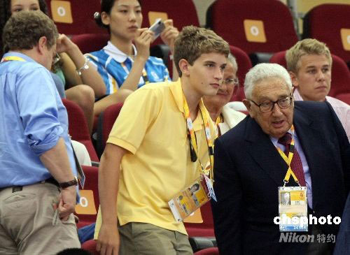 8月9日下午,中國(guó)女籃在北京奧運(yùn)會(huì)籃球館--五棵松體育館舉行的小組賽首場(chǎng)比賽中,以67比64險(xiǎn)勝擊敗西班牙隊(duì)。前來(lái)參加北京奧運(yùn)會(huì)開(kāi)幕式的美國(guó)前國(guó)務(wù)卿基辛格,在家人陪伴下到場(chǎng)觀看。中新社發(fā) 任晨鳴 攝