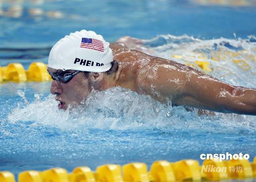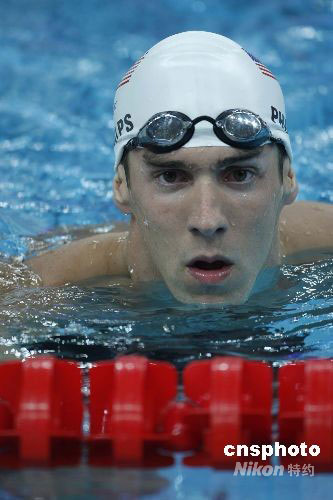 8月9日,北京奧運(yùn)會(huì)游泳大戰(zhàn)在國(guó)家游泳中心“水立方”揭開(kāi)序幕。力爭(zhēng)在本屆大賽奪取8枚金牌的美國(guó)游泳名將菲爾普斯在當(dāng)日進(jìn)行的男子400米混合泳預(yù)賽中以4分07秒82的成績(jī)打破奧運(yùn)會(huì)紀(jì)錄,顯示了良好狀態(tài)。中新社發(fā) 杜洋 攝
