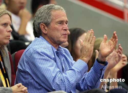 8月9日晚,雅典奧運會冠軍美國女籃在北京奧運會籃球館——五棵松體育館開始衛(wèi)冕之旅。美國總統(tǒng)布什一家悄悄來臨,坐在奧林匹克大家庭普通看臺上觀看比賽,為美國女籃加油。 中新社發(fā) 任晨鳴 攝
