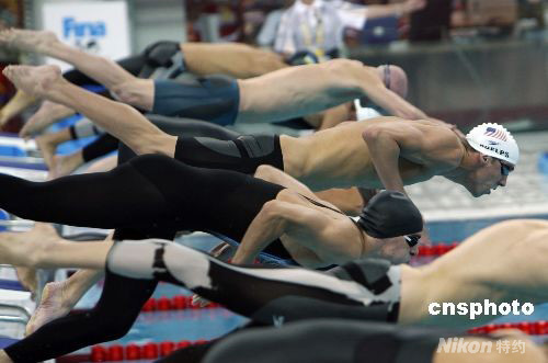 8月9日,北京奧運(yùn)會(huì)游泳大戰(zhàn)在國(guó)家游泳中心“水立方”揭開(kāi)序幕。美國(guó)游泳名將菲爾普斯在當(dāng)日進(jìn)行的男子400米混合泳預(yù)賽中以4分07秒82的成績(jī)打破奧運(yùn)會(huì)紀(jì)錄,輕松入圍。 中新社發(fā) 杜洋 攝