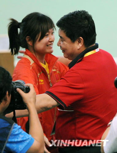 中國(guó)選手郭文珺(左)與中國(guó)射擊隊(duì)總教練王義夫擁抱,慶祝勝利。新華社記者 李尕?cái)z(來源:新華網(wǎng))