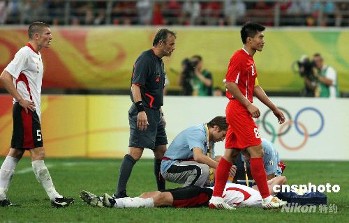 北京時間8月10日晚,奧運男足賽第二輪打響。中國國奧隊在沈陽迎戰(zhàn)比利時國奧隊。經(jīng)過90分鐘的激戰(zhàn),中國國奧隊0:2不敵對手,比賽中兩名中國國奧隊員吃到紅牌被罰下場。 中新社發(fā) 張宇 攝