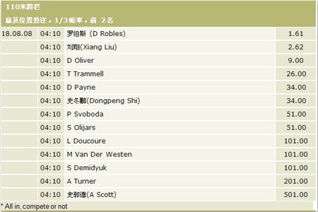 而從單項金牌博彩公司開出的賠率看來,中國軍團在乒乓球、羽毛球和跳水等傳統(tǒng)強勢項目上均位列第一。至于備受關(guān)注的男子110米欄,不同博彩公司就有了差異。如易勝博等仍將劉翔排在首位,賠率為1.8左右,但立博等博彩公司則更看好古巴小將羅伯斯,賠率為1.6左右,低于劉翔的2.6。