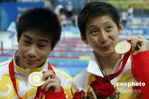 8月11日,中國(guó)“月亮組合”林躍(右)、火亮首次亮相奧運(yùn)大賽,獲得北京奧運(yùn)會(huì)男子10米雙人跳臺(tái)跳水金牌。這是當(dāng)天中國(guó)代表團(tuán)獲得的首枚金牌,也是中國(guó)代表團(tuán)在本屆奧運(yùn)會(huì)上獲得的第七枚金牌。林躍1991年出生,籍貫廣州潮州;鹆脸錾1989年,來自上海跳水隊(duì)。 中新社發(fā) 杜洋 攝