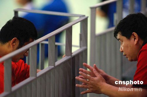 8月12日,北京奧運(yùn)會(huì)男子50米手槍比賽在北京射擊館開(kāi)戰(zhàn),譚宗亮和林忠仔代表中國(guó)射擊隊(duì)出戰(zhàn)。圖為在資格賽中,主教練王義夫臨場(chǎng)指導(dǎo)譚宗亮。中新社發(fā) 盛佳鵬 攝