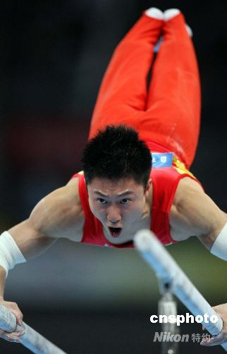 8月12日,北京奧運(yùn)會(huì)體操男子團(tuán)體決賽在國(guó)家體育館展開(kāi),中國(guó)男子體操隊(duì)繼悉尼奧運(yùn)之后再次登頂,以286.125 分獲得金牌,有中國(guó)“雙杠王”之稱的李小鵬在雙杠比賽中獲高分。中國(guó)體操名將李小鵬也超越李寧,成為獲得世界冠軍最多的中國(guó)體操選手。李寧的世界大賽金牌為14枚,李小鵬達(dá)到15枚。 中新社發(fā) 任晨鳴 攝